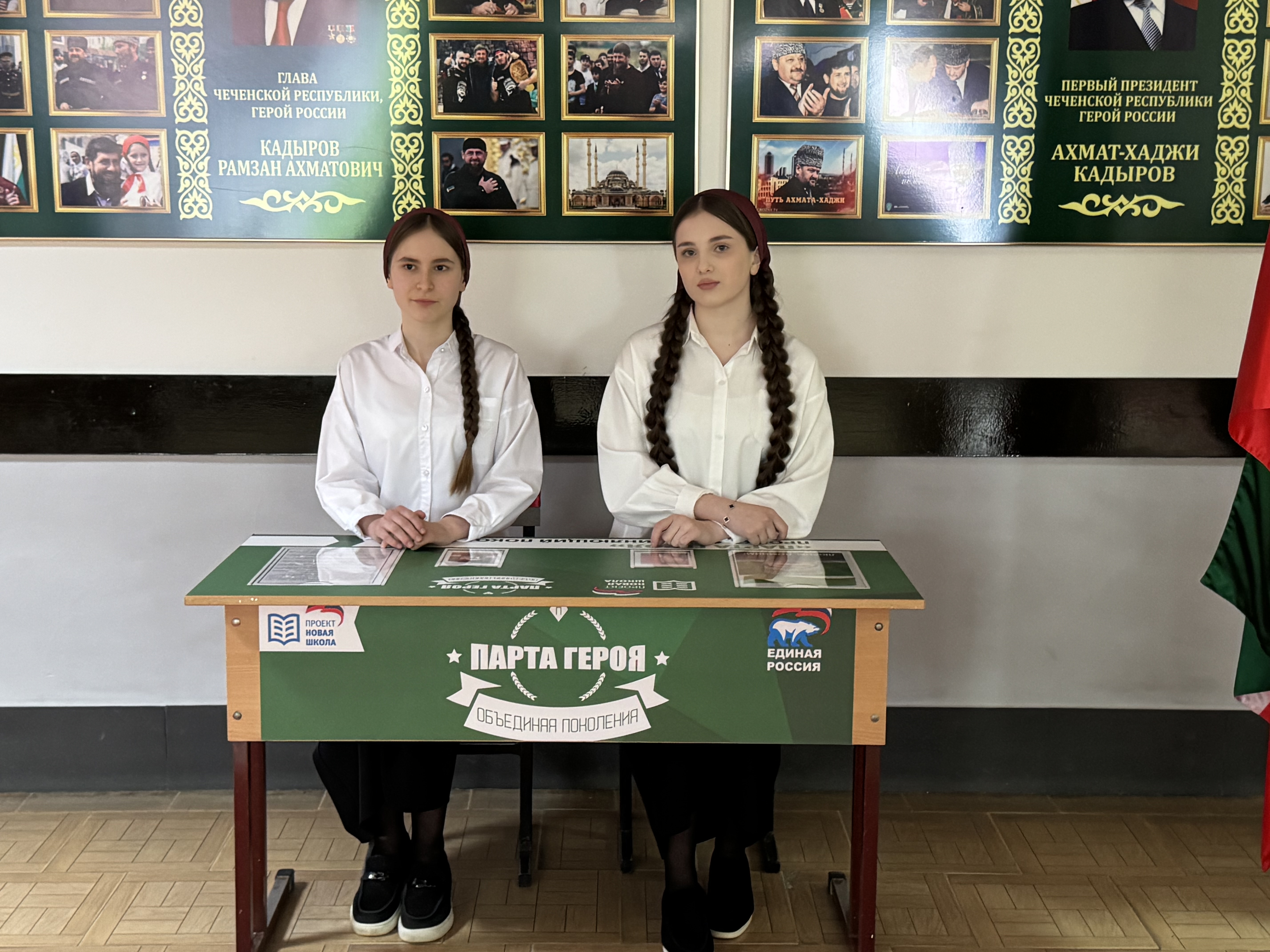 «Парта Героя» — ученический стол с размещенной на нем информацией о заслугах, биографии и фотографией Ахмата-Хаджи Кадырова (Дала г1азот къобала дойла цун).